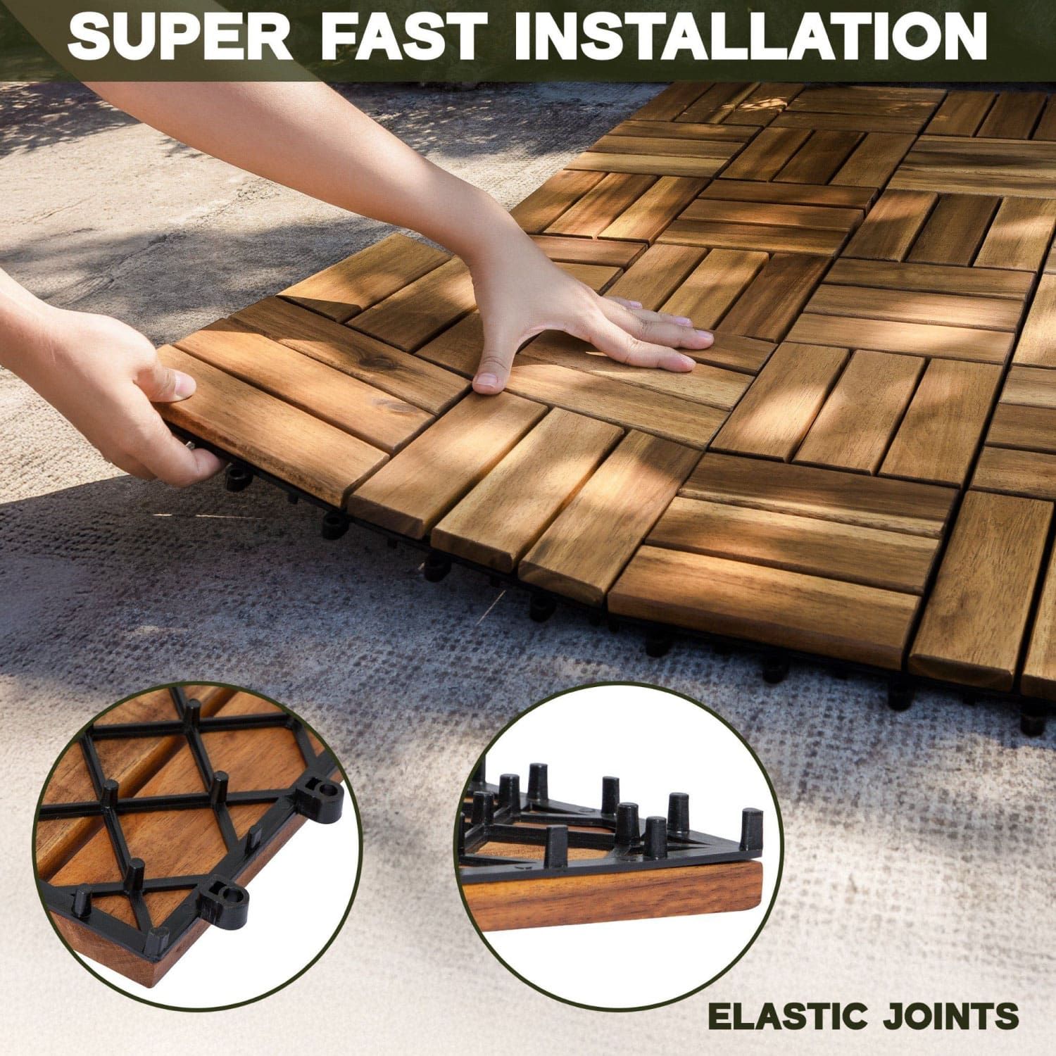 Giải pháp tiết kiệm, đẹp mắt và thân thiện với môi trường cho các khu vực cần lót sàn nhanh gọn, đơn giản. Vỉ gỗ 12 nan đế thấp thích hợp cho ban công, hành lang, phòng tắm, sân nhỏ, hoặc các công trình cần thi công nhanh.